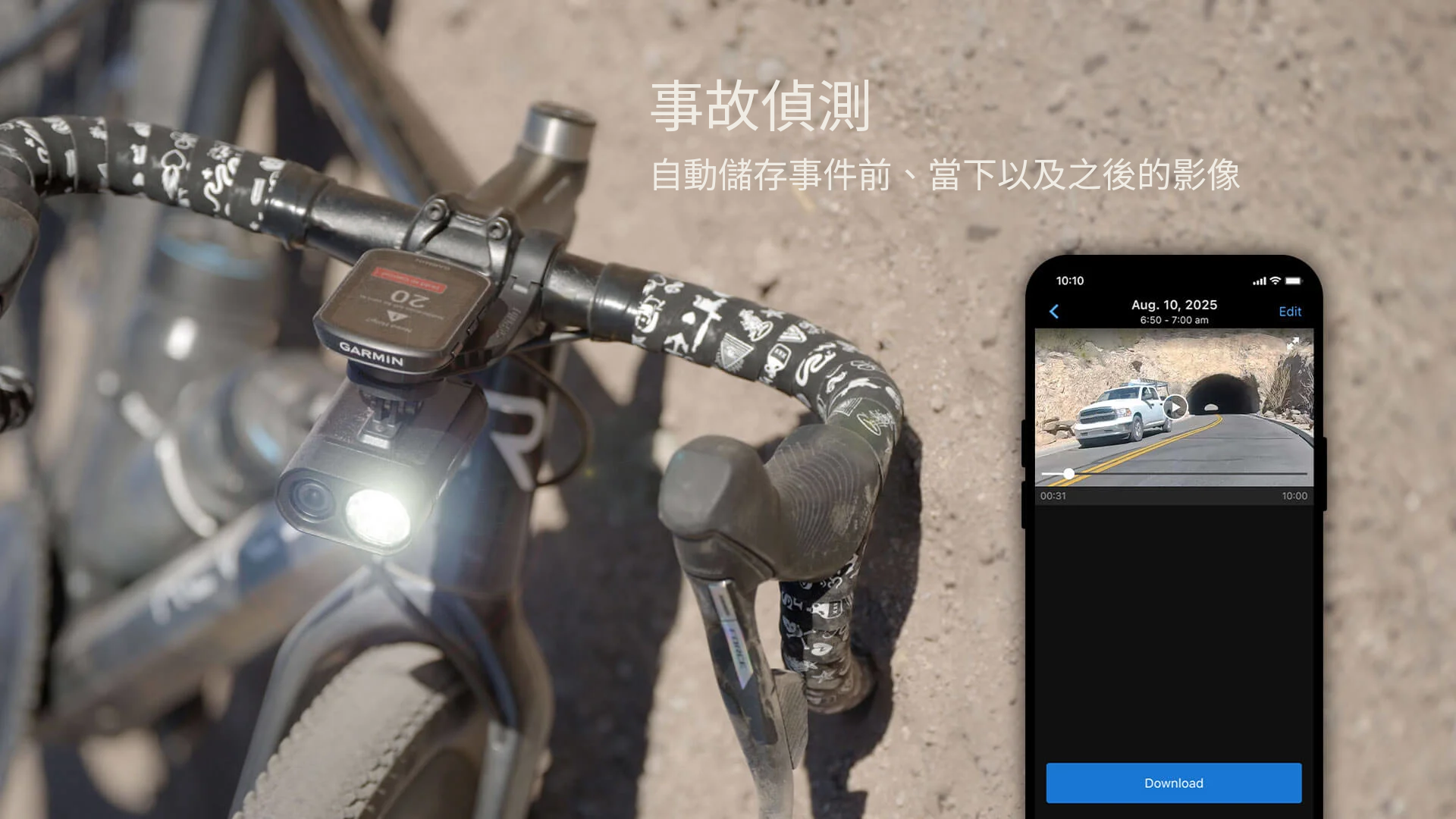 隨時從相容的 Edge 自行車錶或手機上的 Varia app 控制攝影機及前燈設定。
